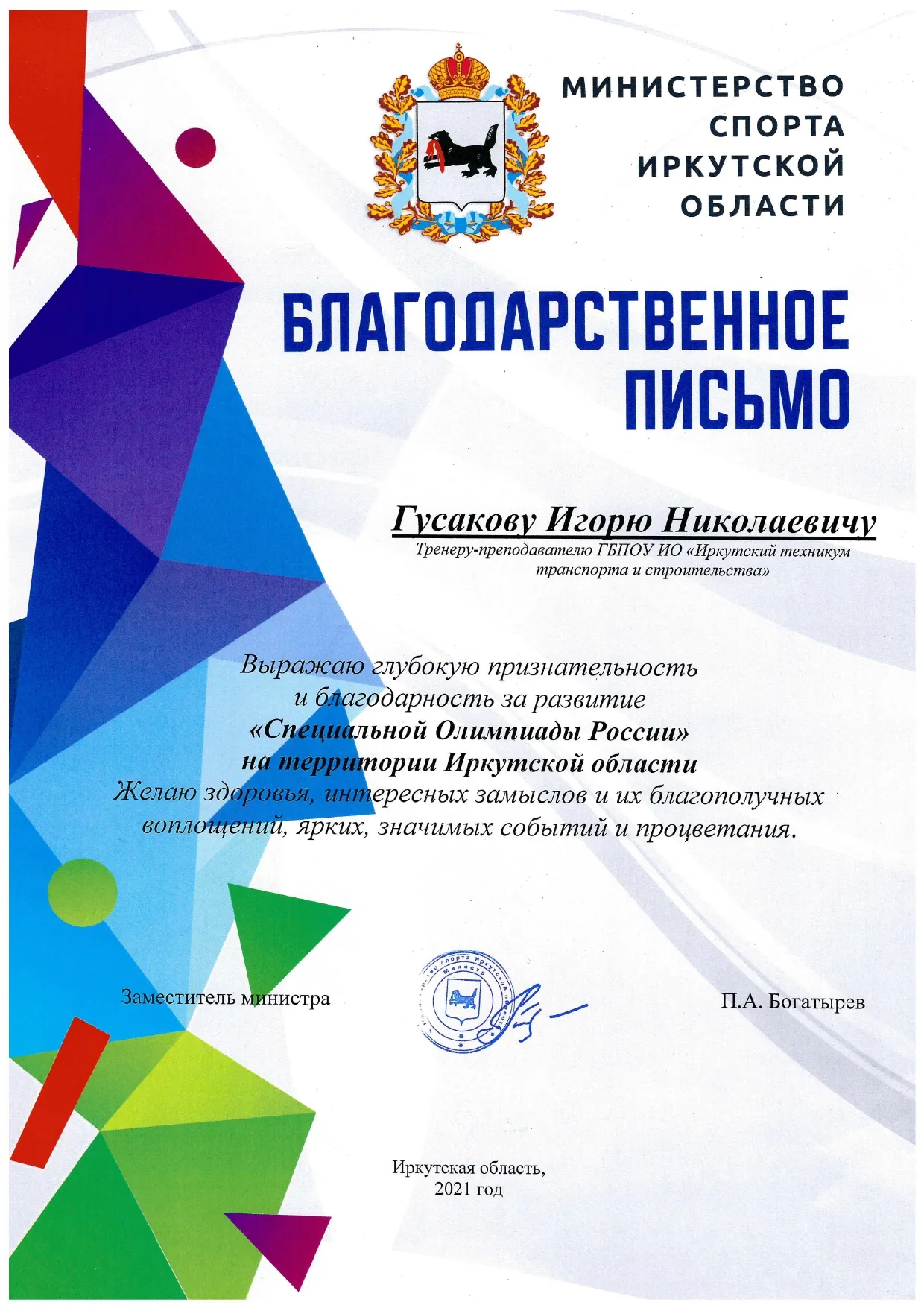 Благодорственное письмо Гусакову И.Н., за развитие Специальной Олимпиады России на территории Иркутской области