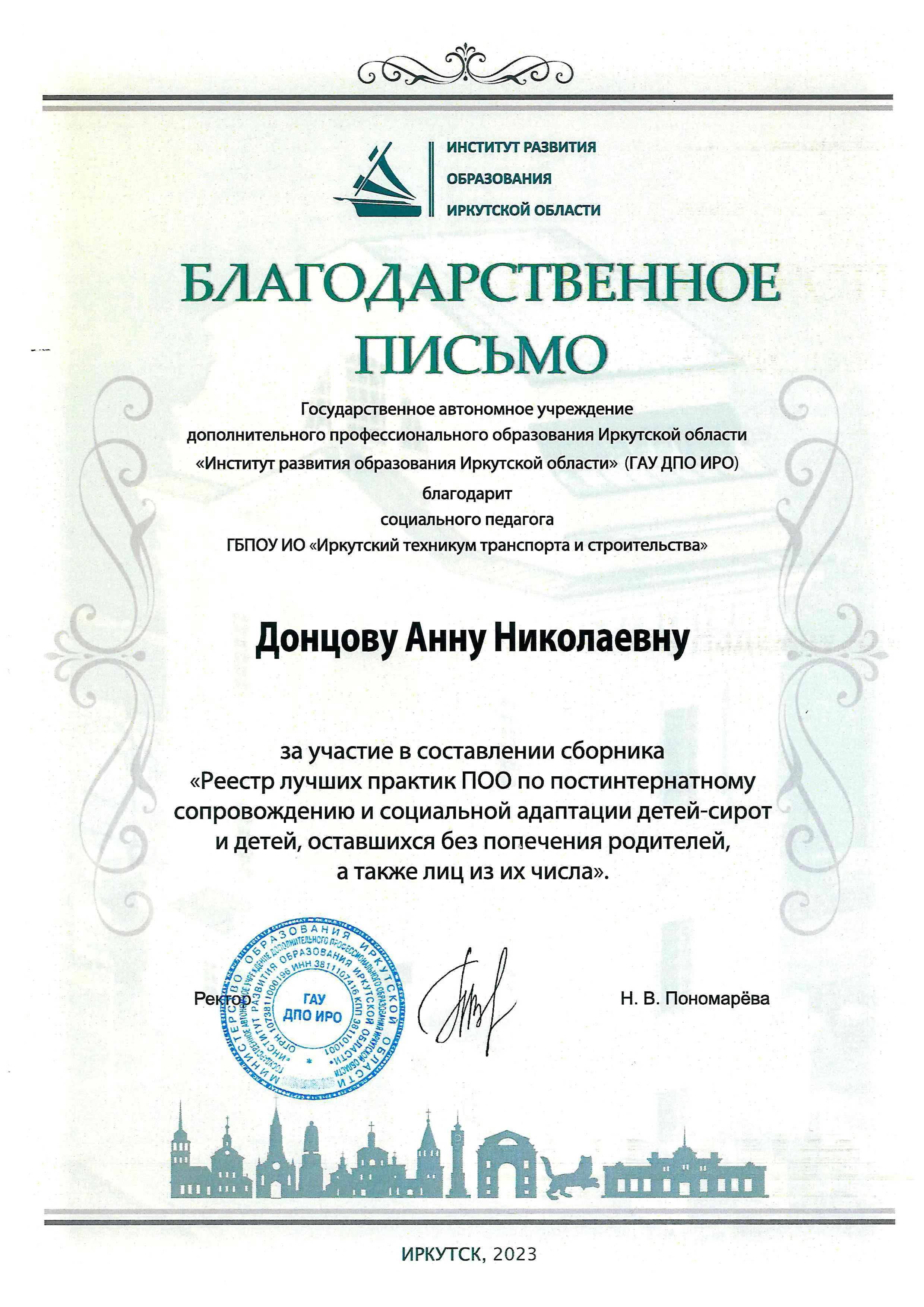 Благодарность Донцовой Анне Николаевне за участие в составлении сборника «Реестр лучших практик ПОО по постинтернатному сопровождению и социальной адаптации детей-сирот и детей, оставшихся без попечения родителей, а также лиц из их числа».