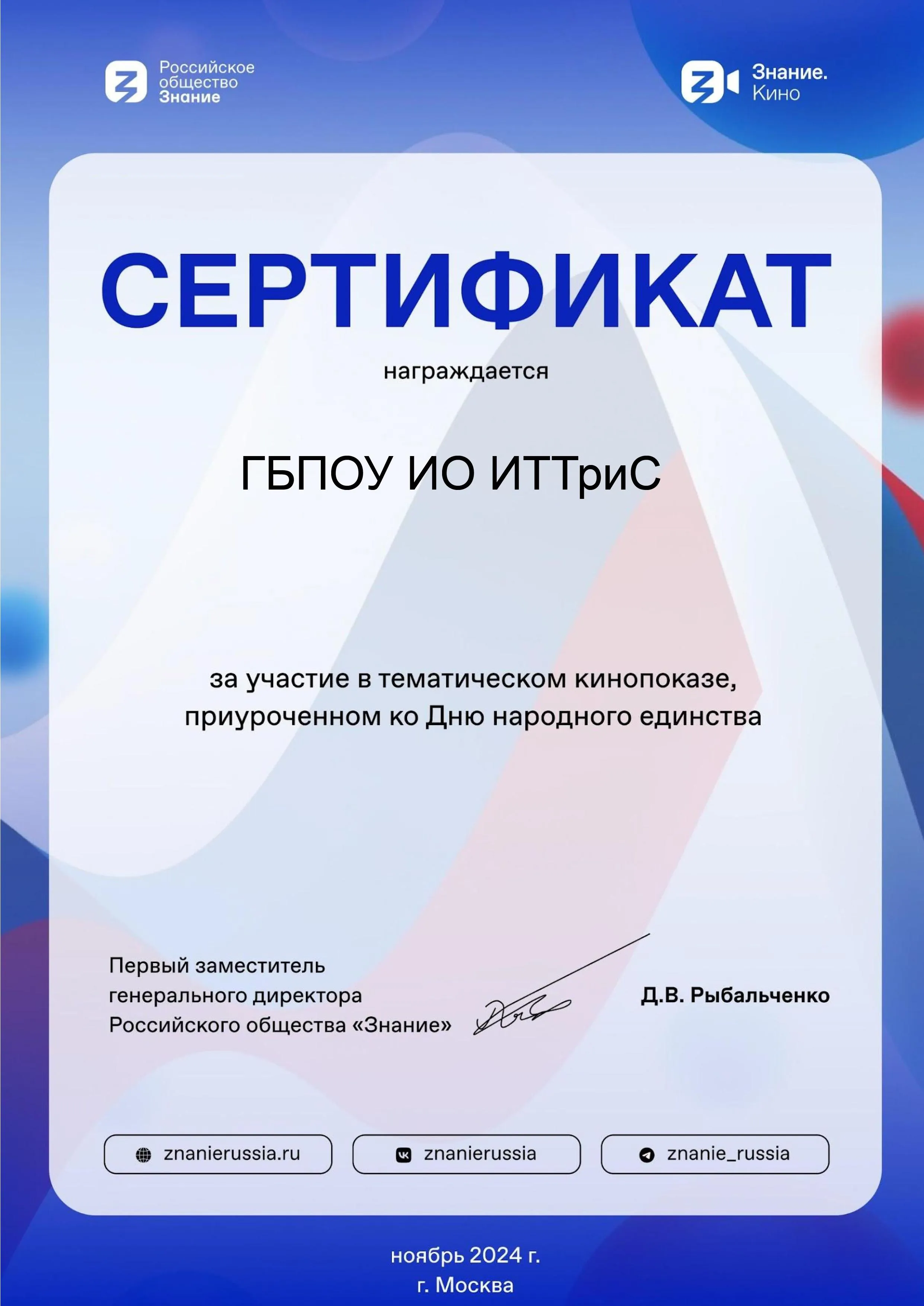 За участие в тематическом кинопоказе, приуроченном ко Дню народного единства